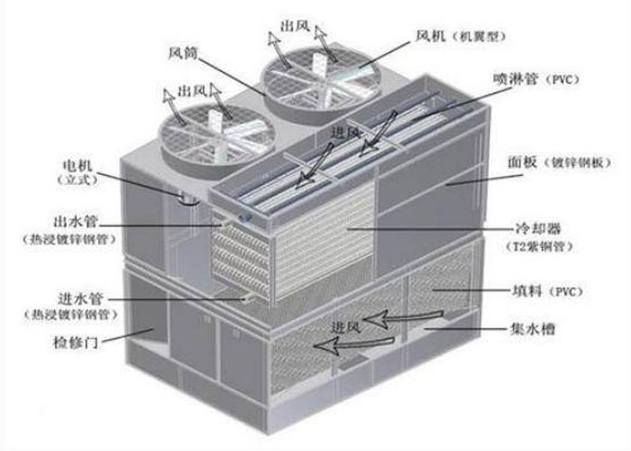 1、閉式冷卻塔實(shí)際上是一種蒸發(fā)式冷卻塔,冷卻器和濕式冷卻塔的組合,它是臥式的蒸發(fā)式冷卻塔,工藝流體在管內(nèi)流過,空氣在管外流過,兩者互不接觸。閉式冷卻塔是傳統(tǒng)冷卻塔的一種變形和發(fā)展。塔底蓄水池內(nèi)的水由循環(huán)泵抽取后,送往管外均勻地噴淋下來。與工藝式流體熱水或制冷劑和管外空氣并不接觸,成為一種閉式冷卻塔,通過噴淋水增強(qiáng)傳熱傳質(zhì)的效果。
