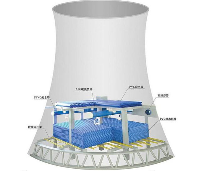 冷卻塔高度一般為75~150米,底邊直徑65~120米。塔內(nèi)上部為風(fēng)筒,筒壁第一節(jié)(下環(huán)梁)以下為配水槽和淋水裝置,統(tǒng)制為淋水構(gòu)架,多用PE或PVC材料制成。塔底有一個(gè)蓄水池,但需根據(jù)蒸發(fā)量連續(xù)補(bǔ)水。淋水裝置是使水蒸發(fā)散熱的主要設(shè)備。運(yùn)行時(shí),水從配水槽向下流淋滴濺,空氣從塔底側(cè)面進(jìn)入,與水充分接觸后帶著熱量向上排出。冷卻過(guò)程以蒸發(fā)散熱為主,一小部分為對(duì)流散熱。雙曲線型冷卻塔比水池式冷卻構(gòu)筑物占地面積小,布置緊湊,水量損失小,且冷卻效果不受風(fēng)力影響;它又比機(jī)力通風(fēng)冷卻塔維護(hù)簡(jiǎn)便,節(jié)約電能;但體形高大,施工復(fù)雜,造價(jià)較高,多用電動(dòng)滑模。