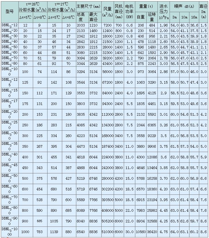 (1)DBNL3系列低噪聲型玻璃鋼冷卻塔——適用于水溫降3—8度的空調制冷機組等一般冷卻場合。